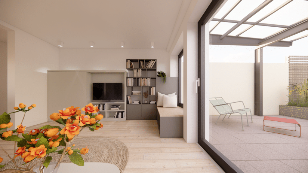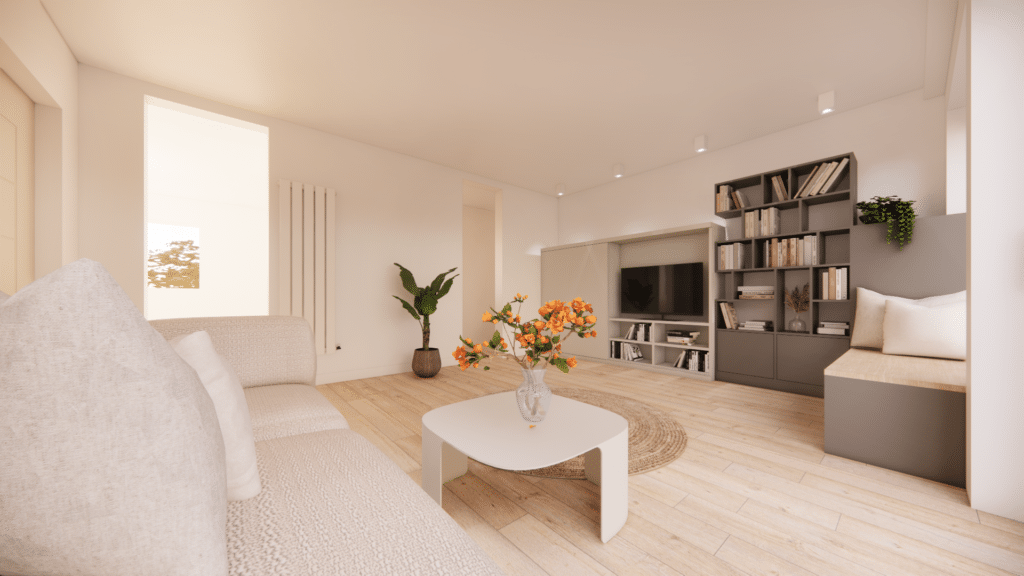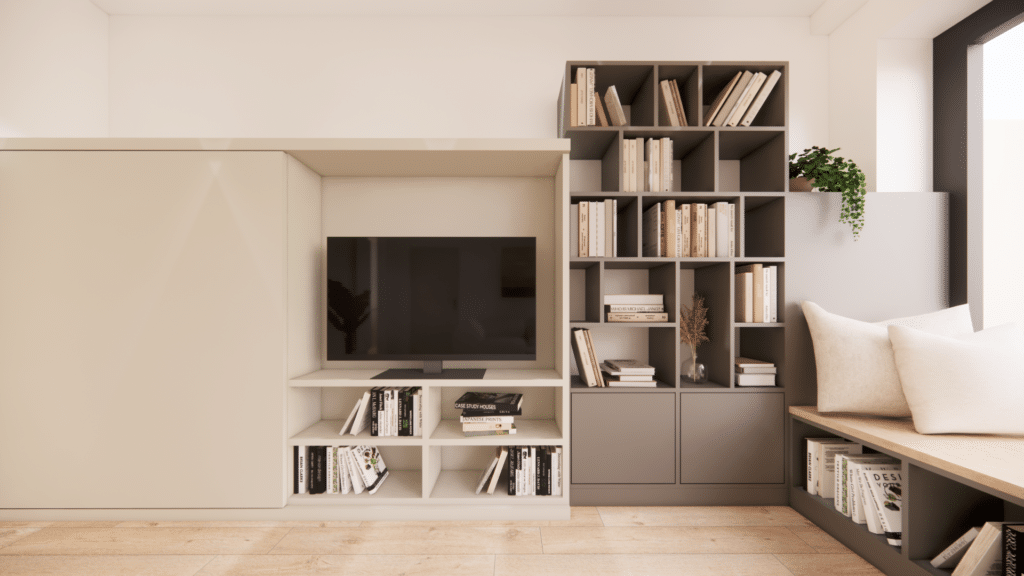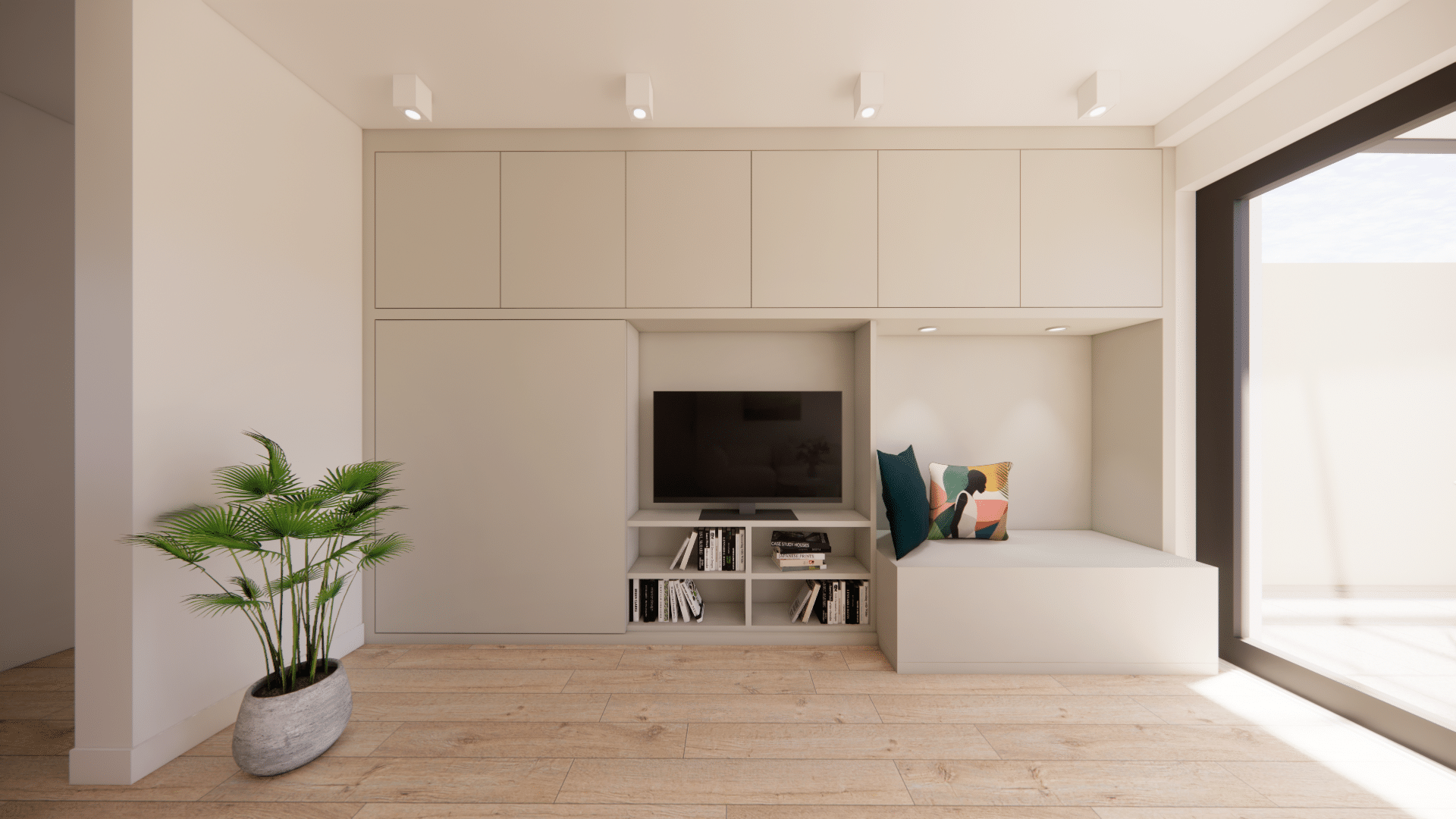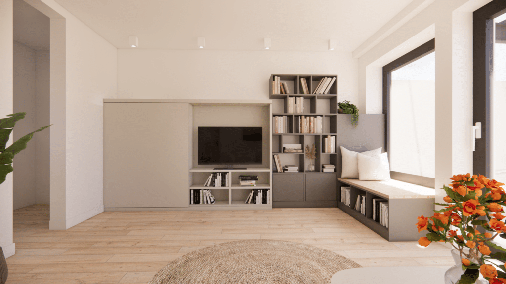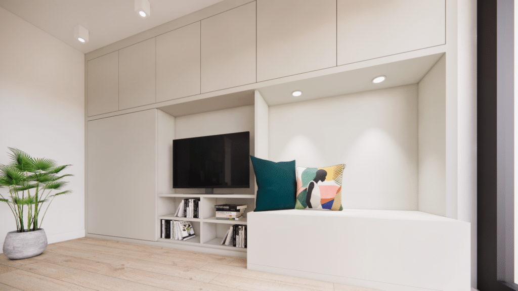 Sitzbank im Fenster unter Einbeziehung eines vorhandenen Wandmöbels