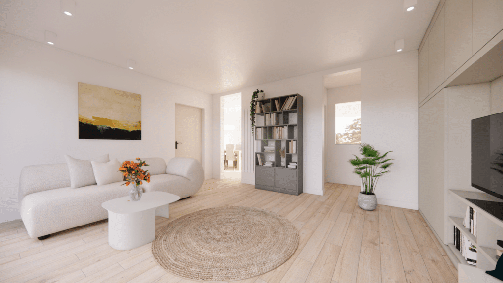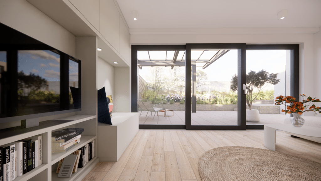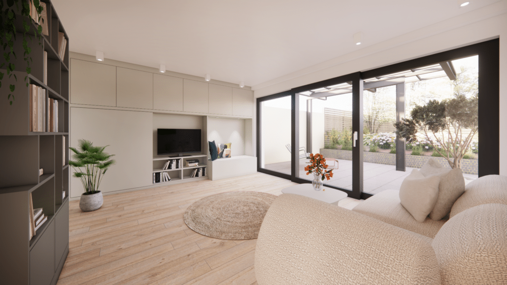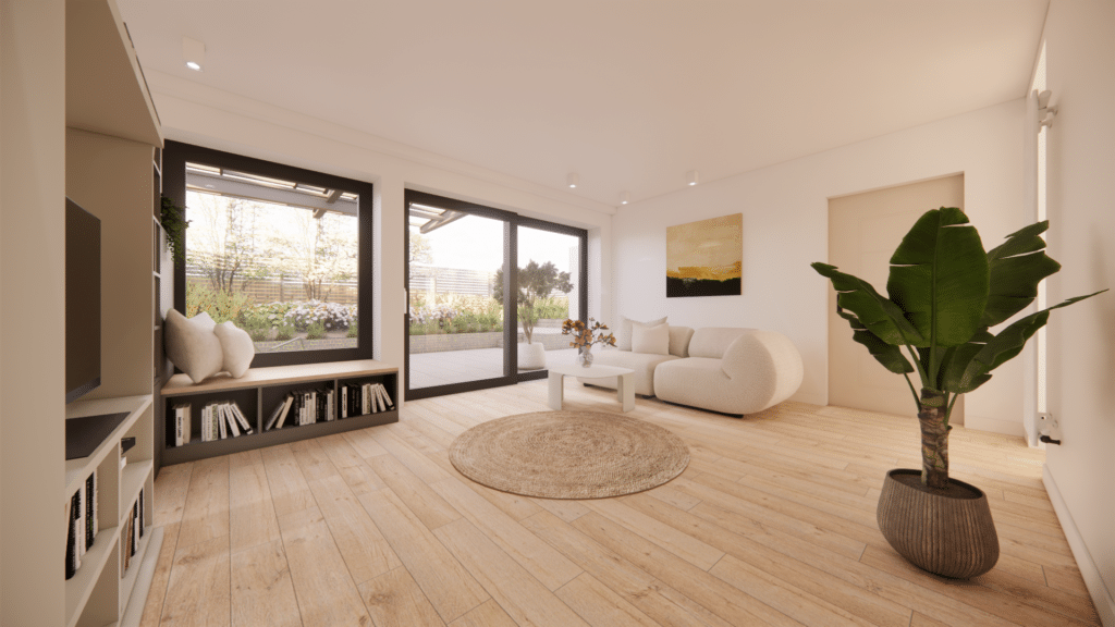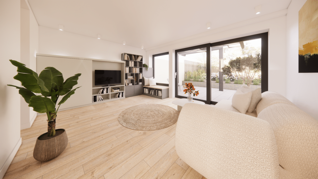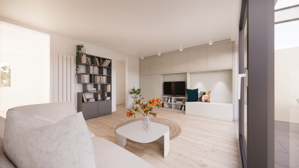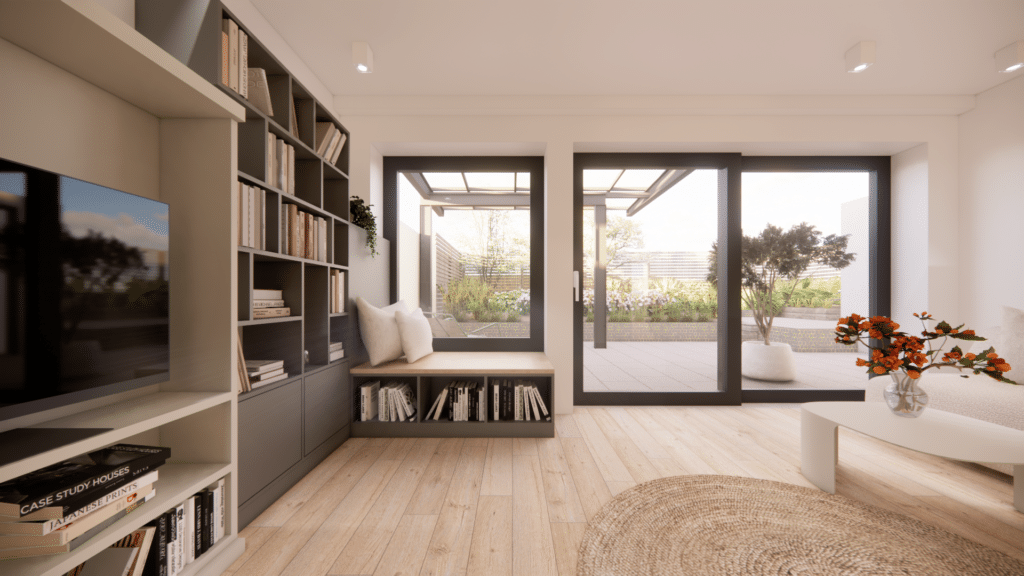 Sitzbank im Fenster unter Einbeziehung eines vorhandenen Wandmöbels